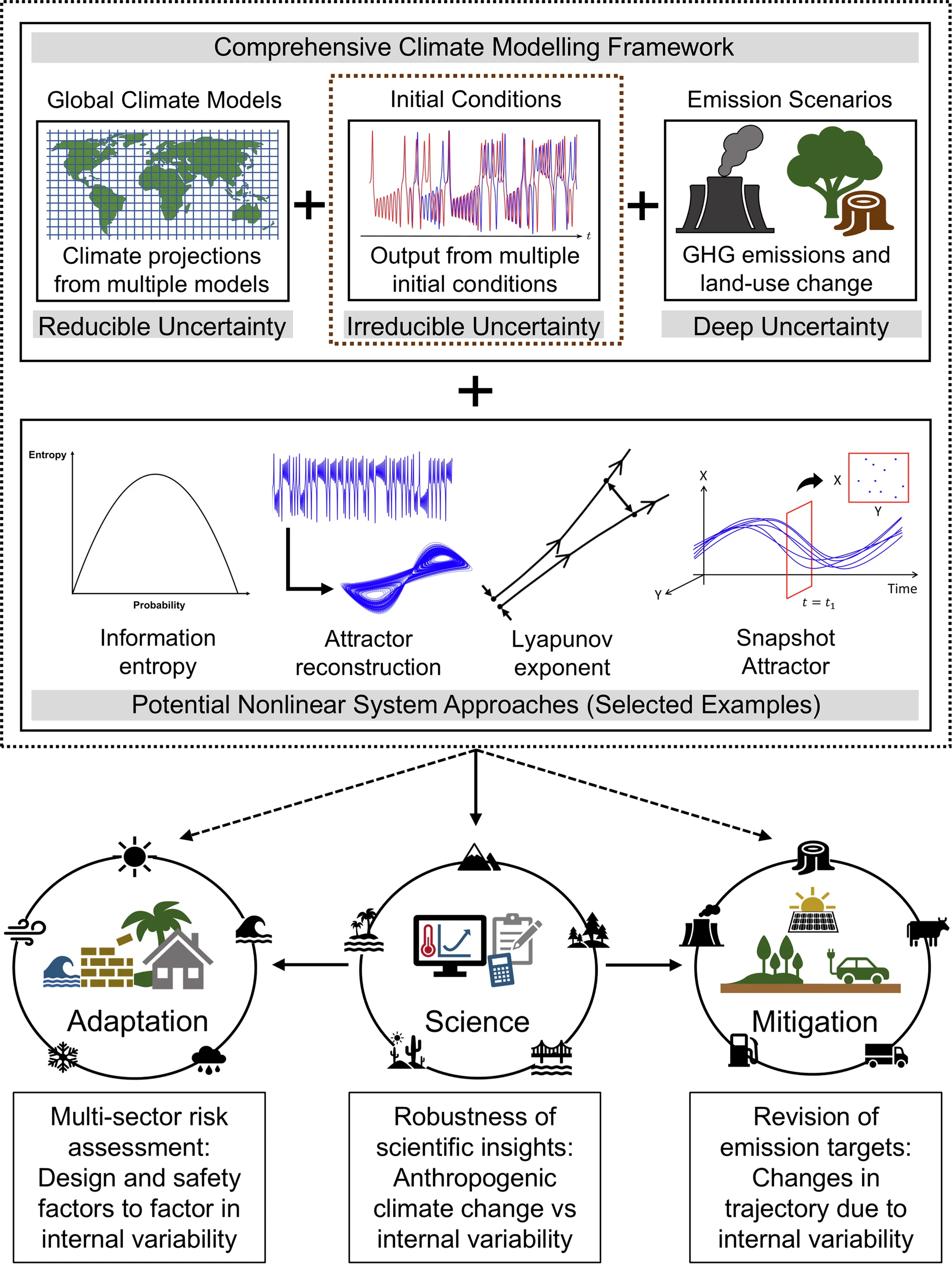 Internal climate variability (ICV) remains a major source of uncertainty in climate projections, complicating impact assessments across critical sectors, especially at stakeholder-relevant scales. Given that ICV emerges from the nonlinear interactions of the climate system, we argue that nonlinear dynamical (NLD) approaches can improve its characterization, providing physically interpretable insights that strengthen adaptation strategies and support multisector decision-making. However, despite their suitability for such problems, NLD approaches remain largely underutilized in the analysis of initial condition large ensembles (LEs). We argue that a diverse suite of NLD approaches offers a promising pathway for systematically extracting robust insights from LEs. If effectively applied and systematically integrated, these methods could fully harness the potential of LEs, uncovering underlying patterns and variability across ensemble members to refine fundamental insights from climate projections. This will help bridge the gap between complex climate dynamics and practical resilience strategies, ensuring that decision-makers, resource managers, and infrastructure planners have a more reliable foundation for navigating irreducible uncertainty.