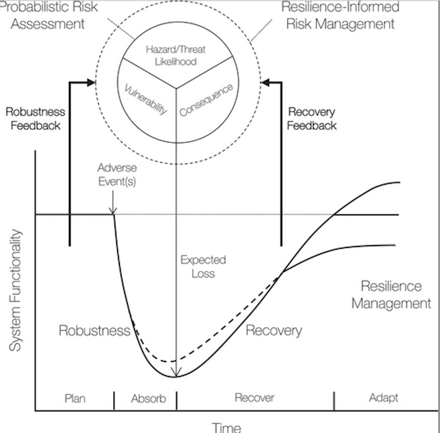 Increase in compound natural and man-made extreme events, and growing interconnectedness of critical societal functions emphasize further understanding of interactions between elements of risk and resilience. While conceptual frameworks have mapped quantified risks to the failure of critical societal functions, feedback from failure and recovery pathways to management of risk has not been systematically considered yet. In this brief perspective, we revisit the risk-resilience feedback paradigm in the context of connected critical societal functions and discuss its role in advancing science-informed disaster policy development. Specifically, we focus on connecting robustness and recovery elements of resilience to the management of risk elements, including threat, vulnerability, and consequence. Furthermore, we briefly describe a notional networked supply chain system example to illustrate how robustness and recovery measures can inform elements of risk. Understanding interactions between elements of risk and resilience is not a fully solved problem. Extending these concepts in the context of connected natural-built-human systems subject to compound and cascading risks is an open challenge. This discussion represents steps toward addressing these challenges.