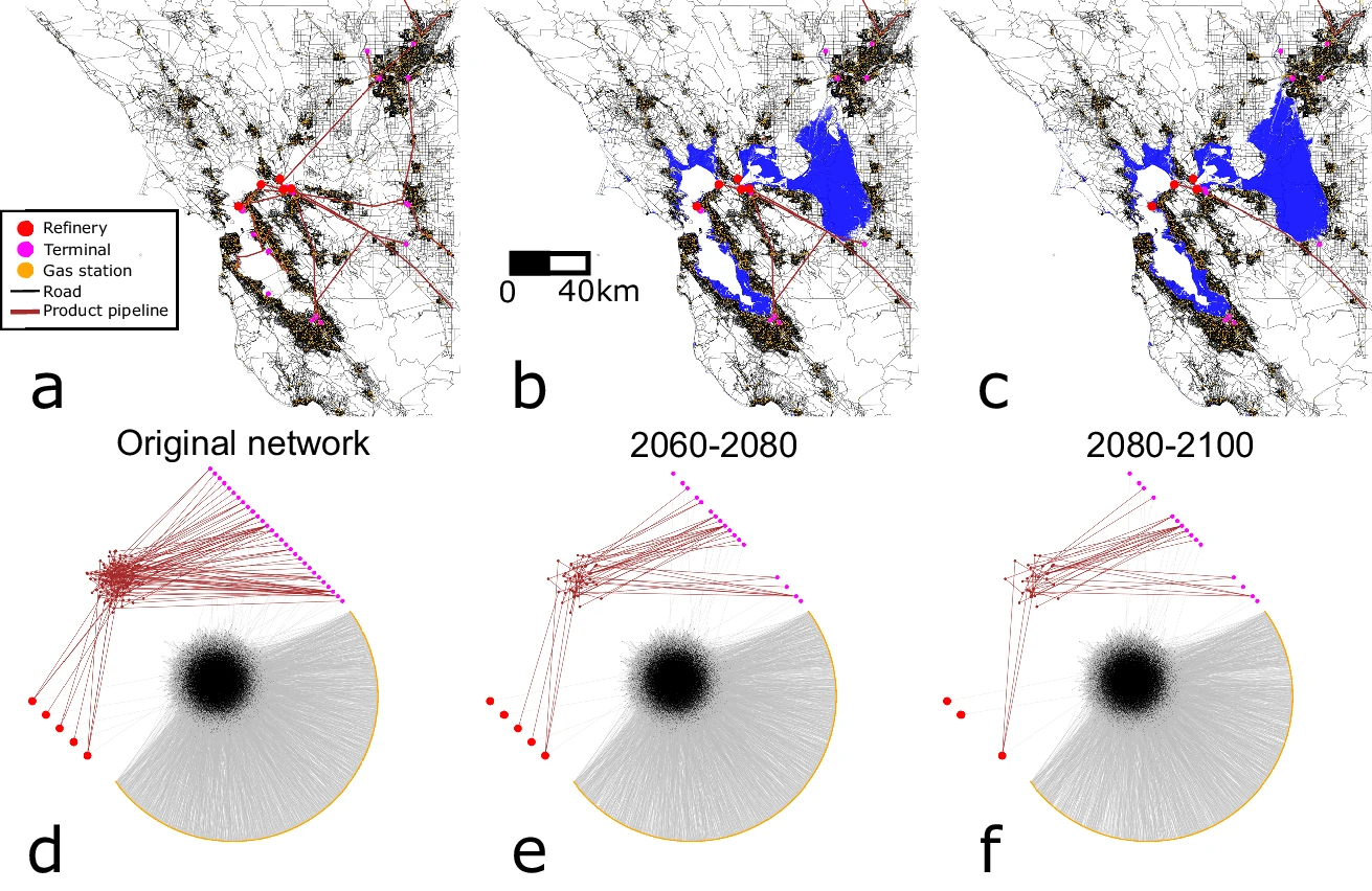 Networked dynamics are essential for assessing the resilience of lifeline infrastructures. The dimension-reduction approach was designed as an efficient way to map the high-dimensional dynamics to a low-dimensional representation capturing system-level behavior while taking into consideration network structure. However, its application to socio-technical systems has not been considered yet. Here, we extend the dimension-reduction approach to resource-flow dynamics in multiplex networks. We apply it to the San Francisco fuel transportation network, considering the flow between refineries, terminals and gas stations. We capture the aggregated dynamics between the facilities of each type and identify macroscopic conditions for the system to supply a given demand of fuel. By considering multiple sea level rise scenarios between 2020 and 2100, we address the impact of coastal flooding due to climate change on the maximum suppliable demand. Finally, we analyze the system’s transient response to production failures, investigating the temporary interruption in production and the duration it takes for complete demand satisfaction to become unachievable after the interruption.